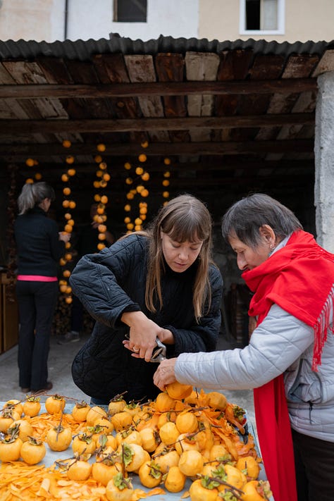 We gathered under the persimmon tree to ask questions about the ecosystem in Pacentro, letting hoshigaki guide us in our inquiry. Of course we leave a lot on the tree for non-human species. Birds and insects love eating the persimmons just as much as us.